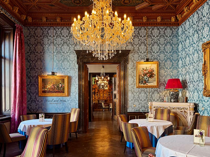 Gerstner 的這個方形桌有個小巧思,桌面是鏡子!所以低頭用餐時依然可以透過鏡子反射欣賞天花板的壁畫裝飾!