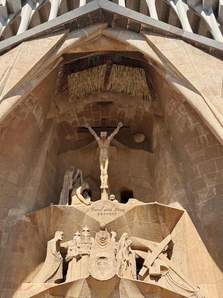 夕陽落下,昏黃的光線灑在聖家堂西邊的受難立面,象徵衰亡,雕刻描繪了耶穌受難到復活升天的景象,是由巴塞隆納雕塑家 Josep Maria Subirachs 完成,雕刻線條俐落很有特色,在蒙塞拉特山修道院以及赫羅納也能看到他的作品喔。